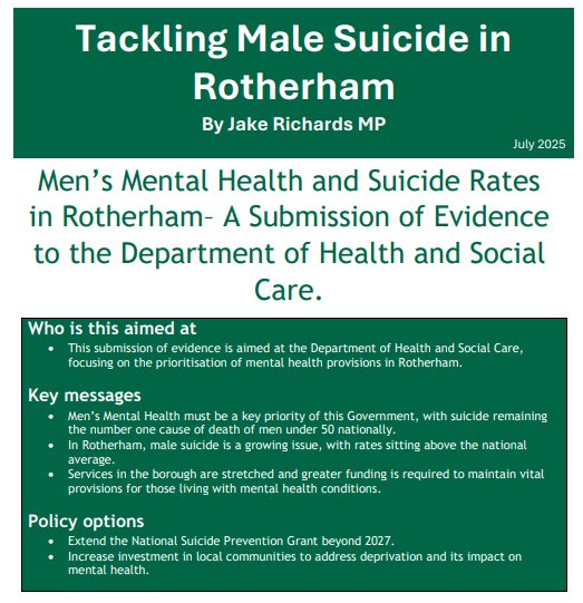 Last week, I submitted a formal submission to the Department for Health and Social Care consultation, calling for urgent support to tackle the growing crisis in men’s mental health across Rotherham.