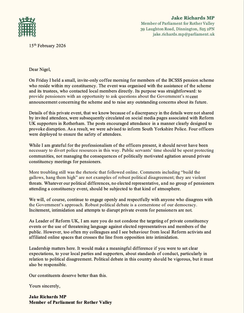 But this behaviour is unacceptable. I’ve met Nigel in Parliament. This is about his leadership now. He must condemn this behaviour and call on the local Reform UK Party in Rotherham to apologise and assure me – and other local politicians – that they will not repeat this behaviour.